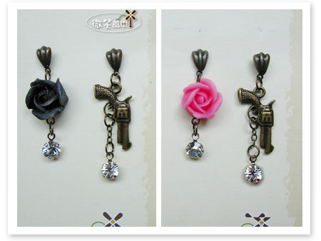 材料:造型耳針(附矽膠耳束)、古銅小槍、軟陶玫瑰、水鑽